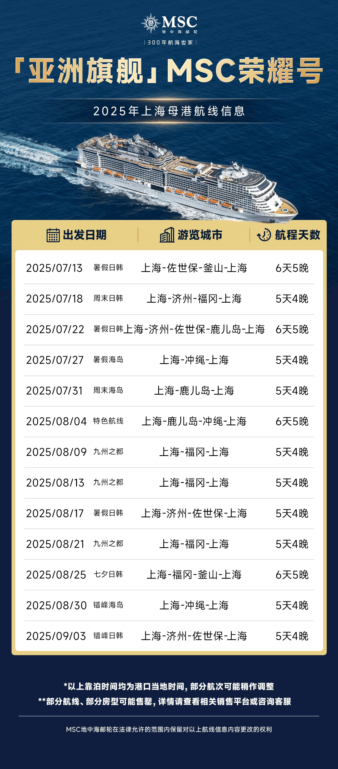 • MSC荣耀号2025年上海母港暑期航次将于7月13日正式开启,并重磅推出"海上名医讲堂"主题活动,特邀沪上权威医疗专家登船,为广大宾客打造“邮轮+康养”新体验。