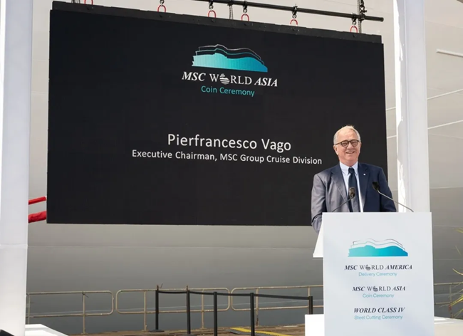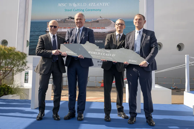 3月27日,MSC地中海邮轮和大西洋造船厂(Chantiers de l'Atlantique)在法国圣纳泽尔市共同庆祝三项“世界”级邮轮的重要里程碑时刻,包括MSC亚美利加号(MSC World America)正式交付、MSC亚细亚号(MSC World Asia)的硬币仪式,以及全新命名的MSC大西洋号(MSC World Atlantic)的钢板切割仪式。