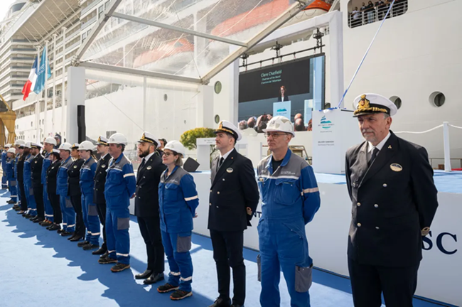 MSC地中海航运集团创始人兼主席Gianluigi Aponte船长、MSC地中海航运集团旗下邮轮业务板块执行主席Pierfrancesco Vago、大西洋造船厂总经理Laurent Castaing、法国工业与能源部部长Marc Ferracci亲临现场,一同出席的还有MSC地中海邮轮新船建造团队的代表,以及在过去30个月中参与邮轮建造的造船厂工人代表。